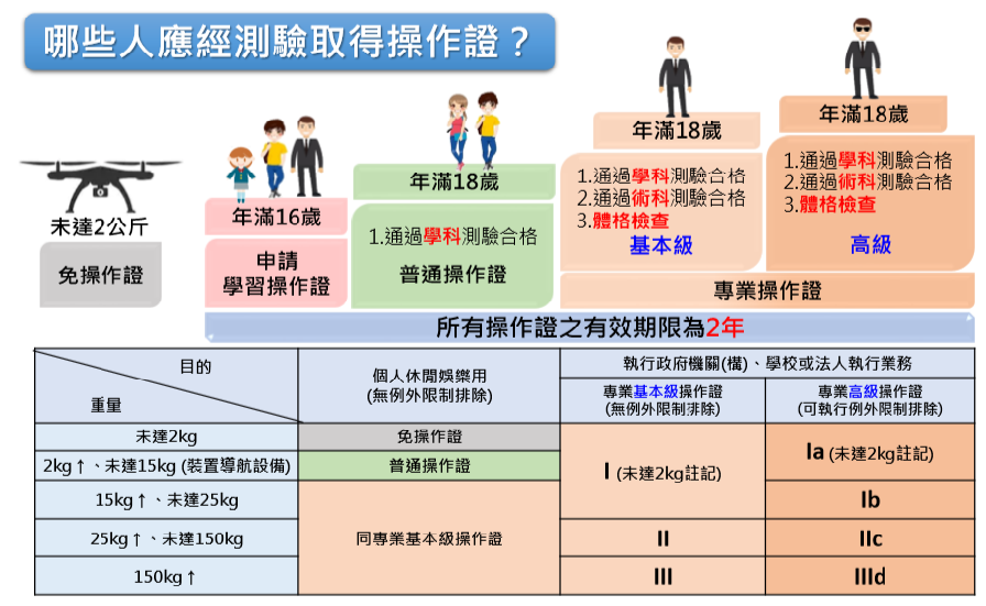 對於政府機關、學校或法人單位而言,只要操作無人機執行業務,操作人員一律必須持有操作證,不分重量;而一般民眾(自然人),若操作2公斤以上至15公斤且具導航系統的無人機,或操作超過15公斤的無人機,則必須依法考取操作證。