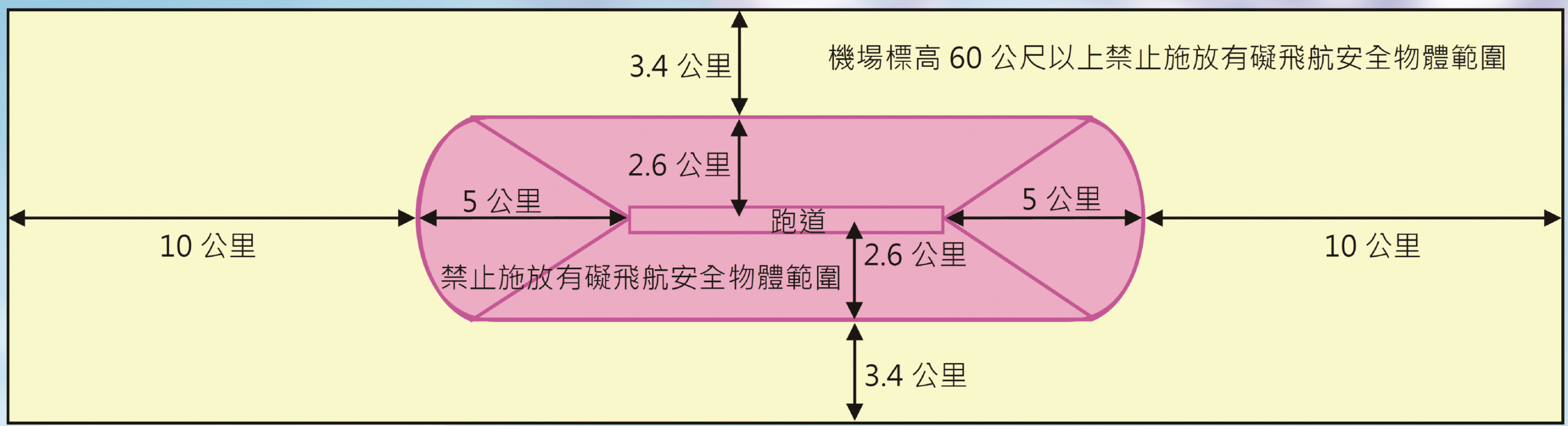 • 跑道兩端中心點延伸5公里外,再向外延伸10公里,跑道中心線向兩側延伸2.6公里外,再延伸3.4公里,形成四邊形範圍