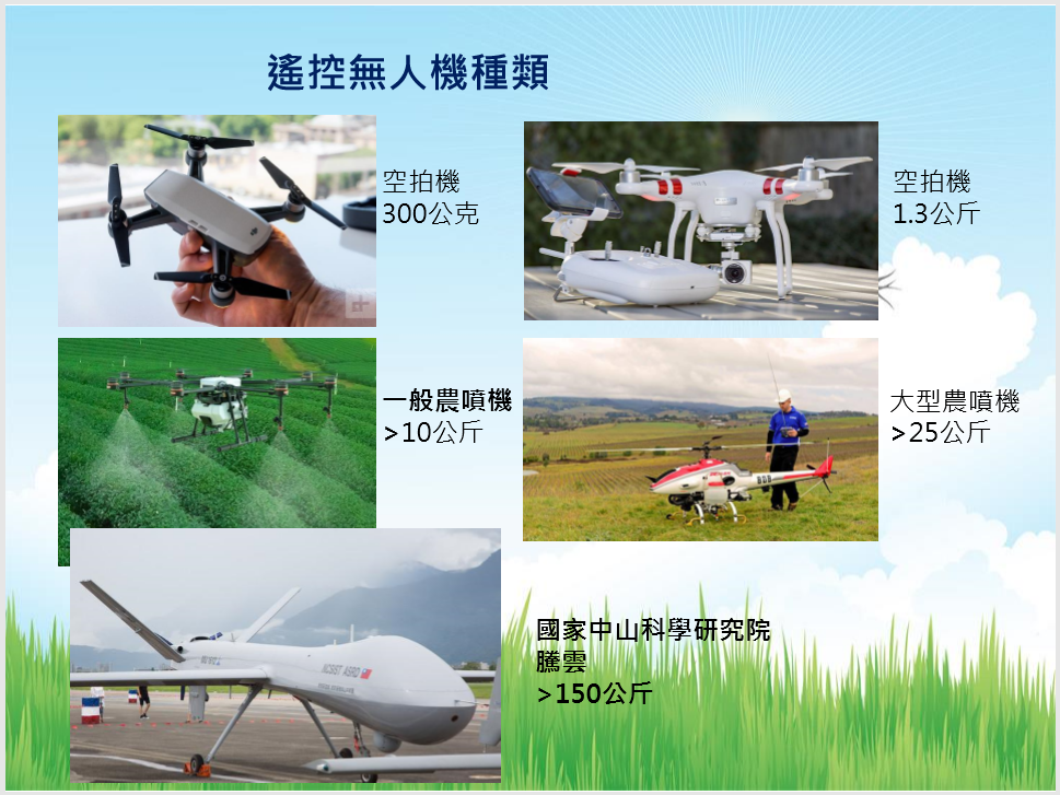 遙控無人機可依其構造分為四大類,分別為無人飛機、無人直升機、無人多旋翼機以及其他經民航局公告的特殊型態。