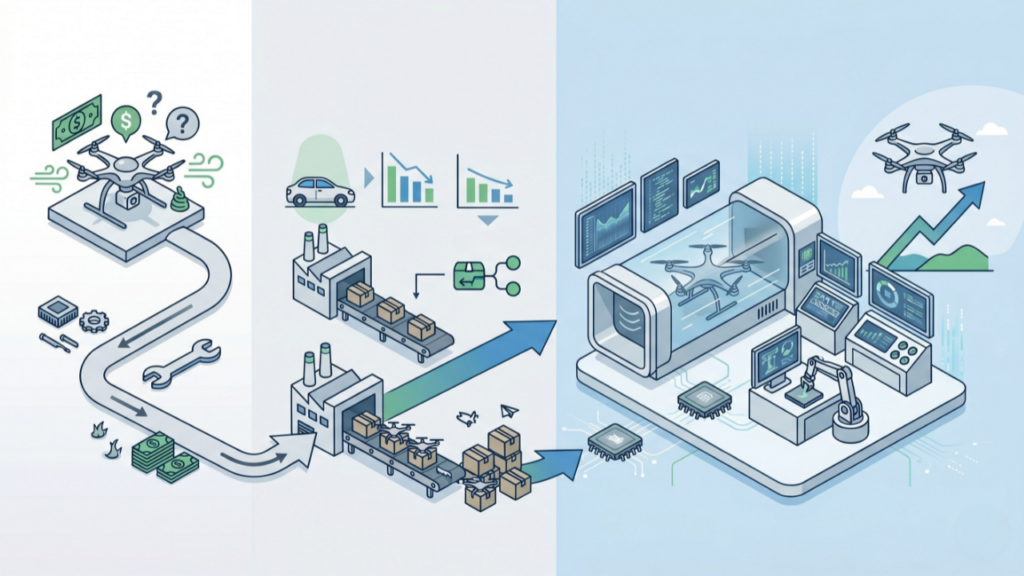 對無人機來說,道理一樣。如果一直停在小量自研、小量生產,就很難解決成本與穩定性的問題。反而是透過引進已經成熟、被市場驗證過的系統或平台,先接上既有需求,把產量拉起來,才有機會跨過從「試作品」走向「產品」的那道門檻。一旦進入穩定量產,零件採購會變便宜,組裝流程會更順,維修與備品也會開始形成體系。